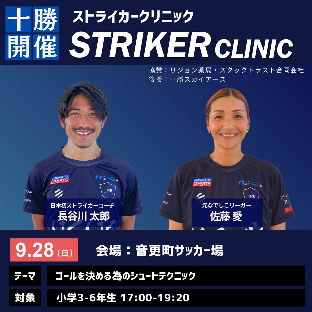 今回のストライカークリニックでは、アカデミー代表であり、日本初ストライカーコーチの「長谷川太郎」となでしこリーグでディフェンダーとして長年活躍してきた「佐藤愛」コーチが担当。ゴールを決めるコツを、ストライカーとディフェンスの両目線で伝えてまいります。